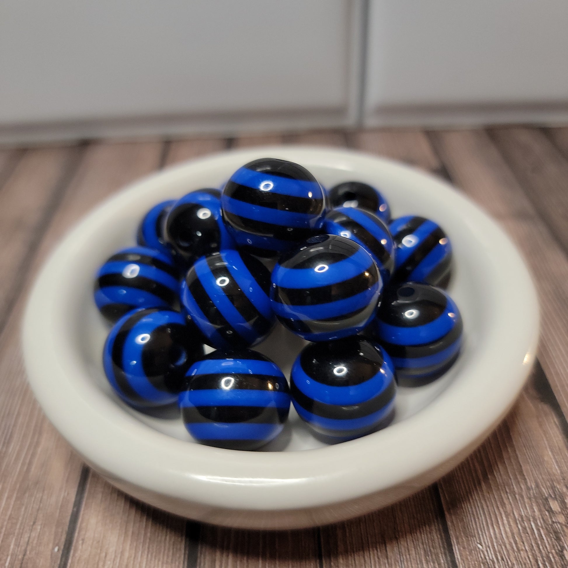 20mm Blue and Black Stripe Beads perfect for home decor and crafts! Available in 1, 4, 12 and 24 packs.