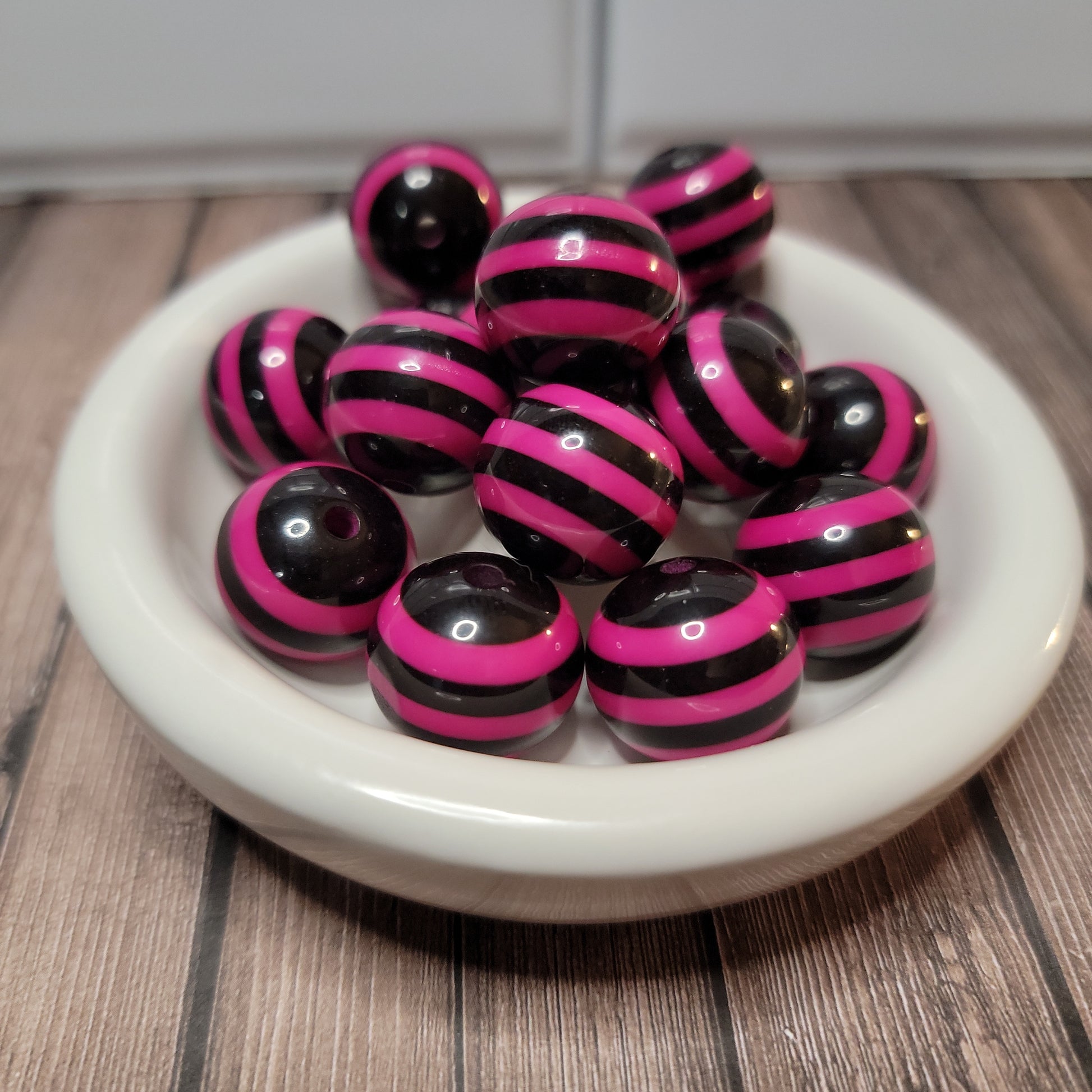 20mm Hot Pink and Black Stripe Beads perfect for home decor and crafts! Available in 1, 4, 12 and 24 packs.