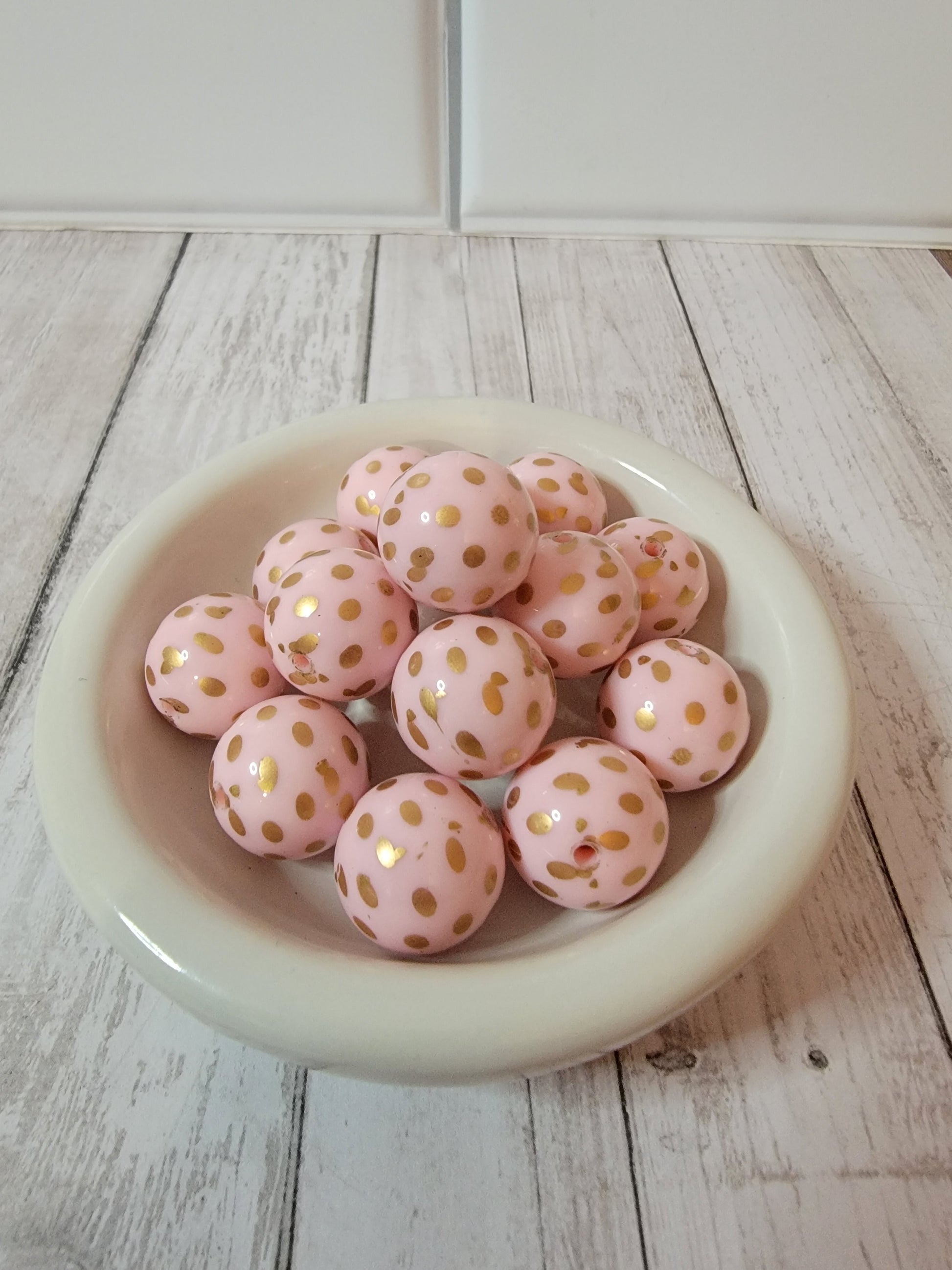20mm Pink and Gold Poka Dot Beads are perfect for home decor or Arts and Crafts! You can purchase in packs of 1, 4, 12 and 24.