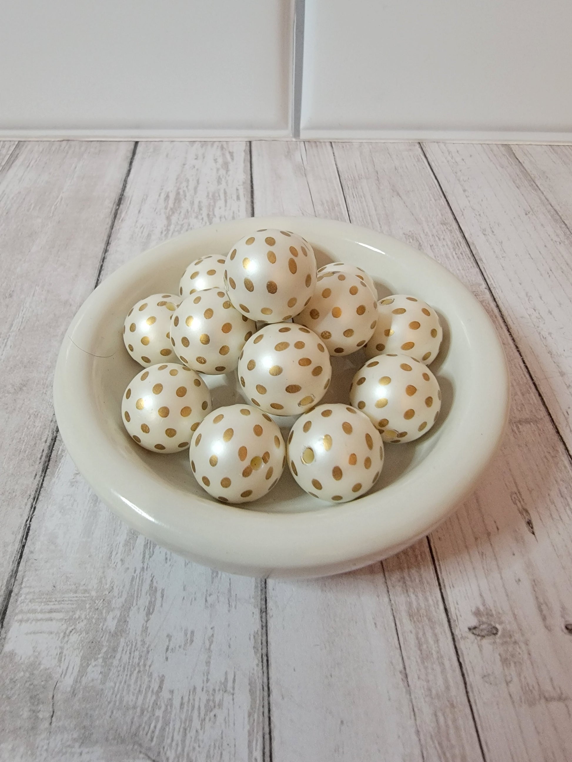 20 MM White and Gold Polka Dot Beads are perfect for home decor or Arts and Crafts! You can purchase in packs of 1, 4, 12 and 24.